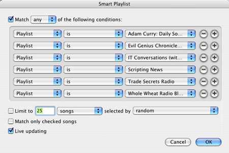 1. Create a smart playlist with all the OR’s called ‘PodcastsAll’: