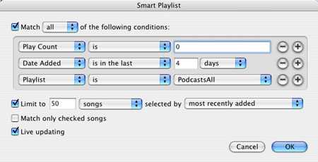 If I have a smart playlist that says “playcount is 0” and “genre is podcast”, assuming all podcasts out there uses “podcast” as the genre, then the ’live updating’ feature will work nicely on the iPod.