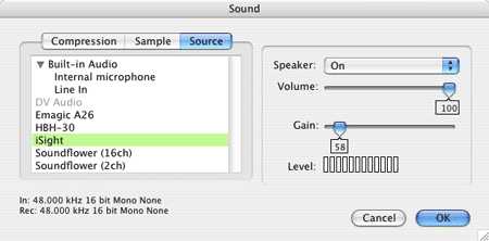 To avoid this we need to set the iSight’s input gain rather low and move our mouth close to the microphone so we ’re coming through clear (and loud).